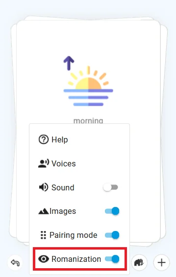 Wenn Sie die Romanisierungsfunktion einschalten (unter dem Zahnradsymbol im Lernmodus), erscheint eine lateinische Transkription unter dem unbekannten Wort.