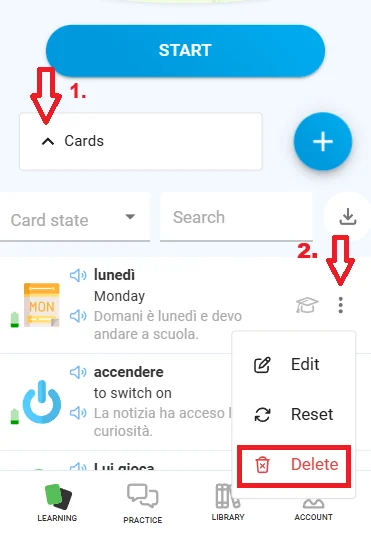 Im Bereich Lernen: Scrollen Sie nach unten zu Karten und klicken Sie darauf. Suchen Sie dann die Karte, die Sie löschen möchten, und klicken Sie auf die drei Punkte auf der rechten Seite.