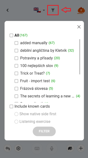 Wenn Sie Vokabeln üben möchten, die sich bereits im Ordner „Bekanntes und/oder Gelerntes“ befinden, können Sie die Filterfunktion nutzen und „bekannte Karten einschließen“.