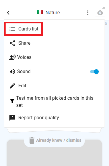 Wenn Sie die Karten eines Kurses ansehen möchten, den Sie bereits abgeschlossen haben, müssen Sie das Set als „Kartenliste“ öffnen. Dann können Sie wieder Wörter zum Speichern auswählen.
