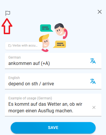Wenn Sie in einem Set oder Kurs eine andere Sprache sehen als die, die Sie gerade lernen – oder wenn die Übersetzung in einer anderen Sprache erscheint als der, die Sie als Ihre bekannte Sprache ausgewählt haben – markieren Sie die Karte bitte zur Überprüfung. Klicken Sie dazu auf das kleine Bearbeitungssymbol (Stift), woraufhin in der oberen linken Ecke eine Flagge erscheint. Sie können uns auch über das Hilfe-Center in der App kontaktieren, um das Problem zu melden.