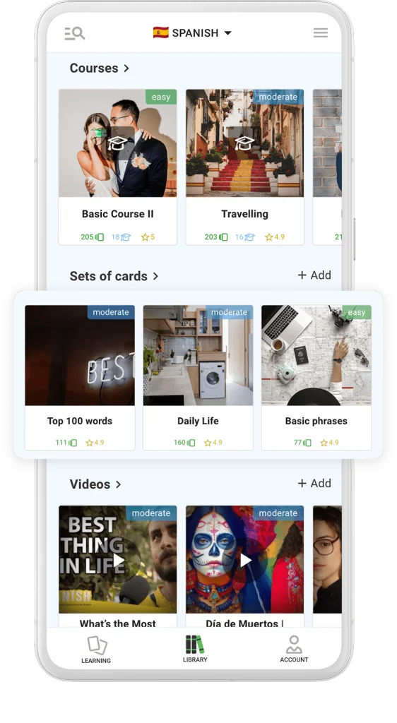 Study new words and phrases you pick from thematic sets of cards